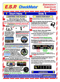 CheckMate™ assists the NON-PILOT in controlling the aircraft, reaching help on the radio, and if necessary, landing the aircraft. The graphical format makes it easy and comfortable to follow. E.S.P. CheckMate™ can easily be the difference in the outcome of this most serious type of emergency. For safety and readability, we are publishing only in 7.5" x 10" size. |