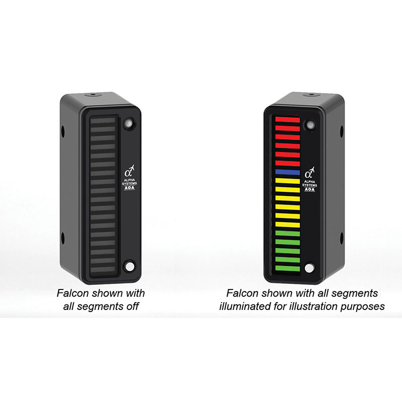 The Falcon kit has a vertical light bar style display. With the vertical light bar display, when you come in for a landing you want to fly to the blue LED (on speed for landing). Should you come in with too low of an angle of attack, the display will illuminate into the yellow, telling you to put your nose up. Should you come in with too high of an angle of attack, the display will illuminate red, telling you to put your nose down. |