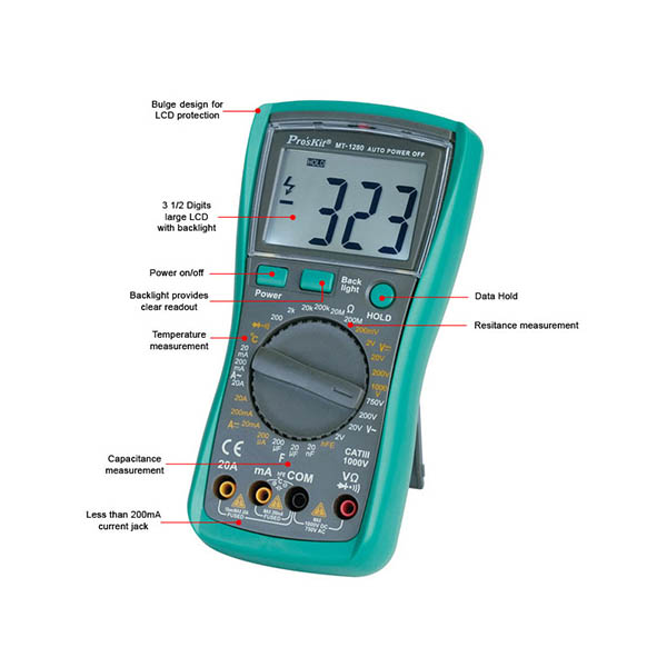 This rugged multimeter is designed to give reliable, accurate readings under the most extreme conditions. The case is double-injection molded and it also has a removable heavy vinyl casing to guard against impact. Measures voltage, amperage, resistance, continuity, capacitance, temperature, and diode checks. Positive stop rotary switch selects any of over 40 different functions. |