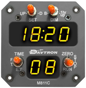 The Davtron M811C is FAA Approved as an advanced time-keeping device equivalent and hence a replacement for the sweep-second-hand clocks of old. The unit is considered a replacement for clocks in Part 23, Class I and II IFR aircraft per advisory circular AC 20-94A. |