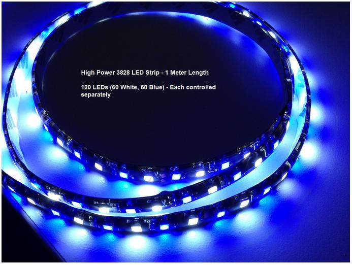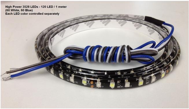One meter length, just 3/8" wide and 3mm high 120 high-power type 3528 LEDs per meter. 12 or 24 Volt version available. Less than 0.9A current comsumption Dual-colors - 120 LEDs per meter (60 color, 60 Bright White) High power 3528 LEDs provide plenty of lighting in both color and white light 3M tape applied for easy installation Power terminals on both ends (one end pre-wired) permit you to cut and re-use a portion Colors: Blue/White 12 or 24 Volt versions Very bright LED output: