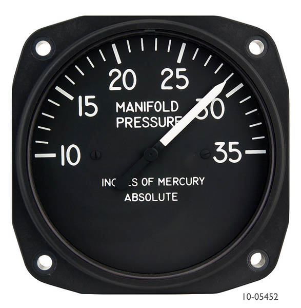 Manifold Pressure Gauge. Engineered for durability, this pressure gauge utilizes an internal bellows system to measure the absolute pressure of the aircraft engine intake in inches. |