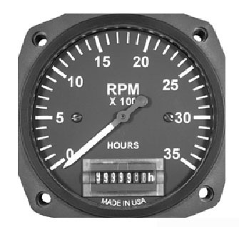 3 1/8" Analog Tachometer w/hourmeter. 4 Cylinder. 0-3500 RPM. Records engine time above a set RPM point. Standard set point is 1800 RPM. Engine Type: Continental/Lycoming