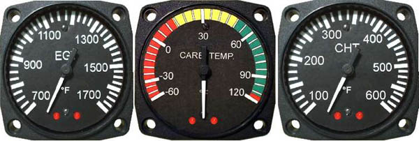 Take a look at UMA's line of unique engine instruments, the 2 1/4", 270°, Opti-Alert warning instruments. These 2 1/4" instruments signal the pilot when there is a problem by illuminating a Light Emitting Diode (LED). This warning indicates that an improper range condition has arisen. Two bright LED's can be set to turn on below and/or above a normal operating range. All gauges use a MS standard 2 1/4" size case with a full sweep analog dial for easy readability with a lightweight design using an air core meter for rugged trouble free operation. All gauges are electronic and operate with a 14V or 28V system. Pressure and temperature gauges use remote mounted sensors which are sold separate. |