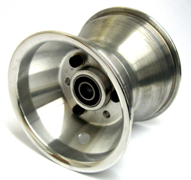 The 5" Spun Aluminum nose wheel with 5/8 bearings. Comes centered when using the MX o-ring standard wheel hub but can also be purchased with the MX offset hub (no o-ring with offset hub. Requires the use of a tube. The bearings are centered and rim halves are mounted from one side, creating a narrower wheel than the std. MX hub).Nose wheels comes complete with nuts, bolts, washers, valve stem, o-rings if required and the MX hub. Can be ran with or without tube. May also be used as main wheels. Wheel width options 5" (2.5"rim & 2.5"rim). |