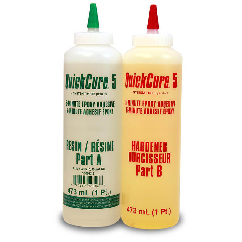| Quick Cure-5 is the standard quick setting "five minute epoxy" system which bonds wood, metals, fiberglass, ceramics, plastics and glass. Mix at a 1:1 by volume ratio. Quick Cure is ideal for all small jobs requiring a strong bond and rapid cure. Quick Cure is highly water resistant but not waterproof. Quick Cure is quite thick, but is easily measured by squeezing equal sized lumps from the convenient application bottles. Not recommended for applications in excess of 200F. |