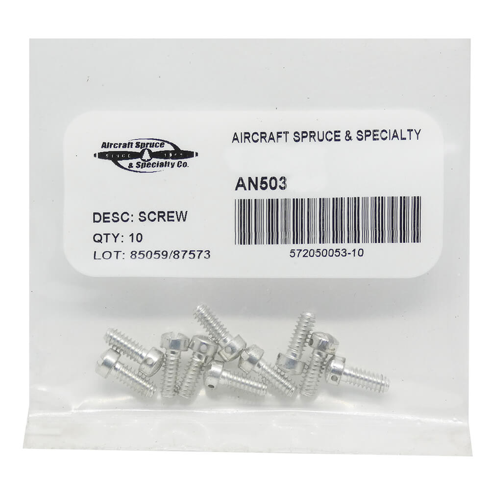 AN503 Fillister Head Screws AN503 (coarse thread) drilled head, slotted fillister head screws are fabricated from steel meeting specification MIL-S-6050. Tensile strength 125,000 PSI. Cadmium plated, Type I Class 3. |