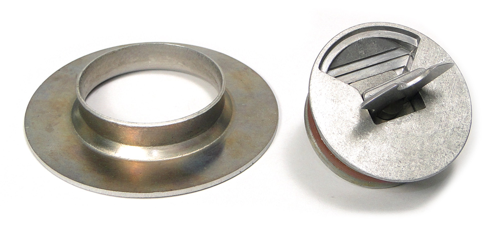 The UD-3 flush fuel cap assembly is an unvented cap similar in design to the #5 style cap. The aluminum mounting ring has a 2" dia. opening and an overall dia. of 3-3/4 inch. It may be riveted, bolted or molded to the tank. It is currently used on many popular homebuilts such as the RV’s, Lancair, Velocity & White Lightning. Specify flat or contoured adapter. |