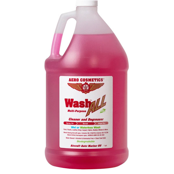Wash ALL is a biodegradable cleaner and degreaser used for those tough, greasy, oily, and grimy cleaning jobs such as aircraft engine areas, landing gear, bellies, and black streaks on RV`s and airplanes, car wheels, tires, boat transom, and water lines. Removes dirt without scratching. Simply spray on and wipe dry. Works on all surfaces such as paint, glass, plastic, leather, vinyl, rubber, wood, gel coat, aluminum, and other hard surfaces.