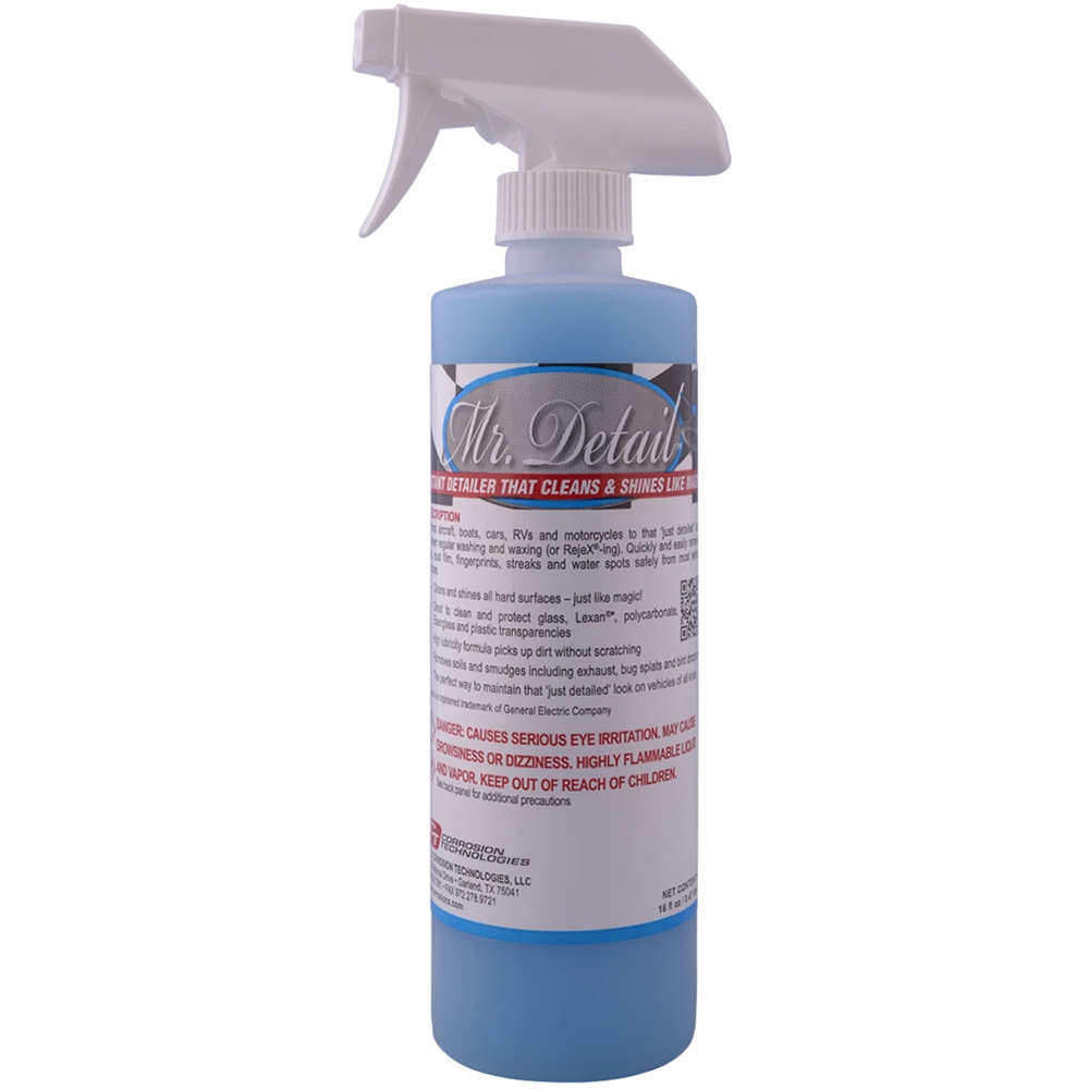 Mr. Detail returns aircraft, boats, cars, RVs and motorcycles to that 'just detailed' look between regular washing and waxing (or RejeX-ing). Quickly and easily removes dust, road film, fingerprints, streaks and water spots safely from most vehicle surfaces.
