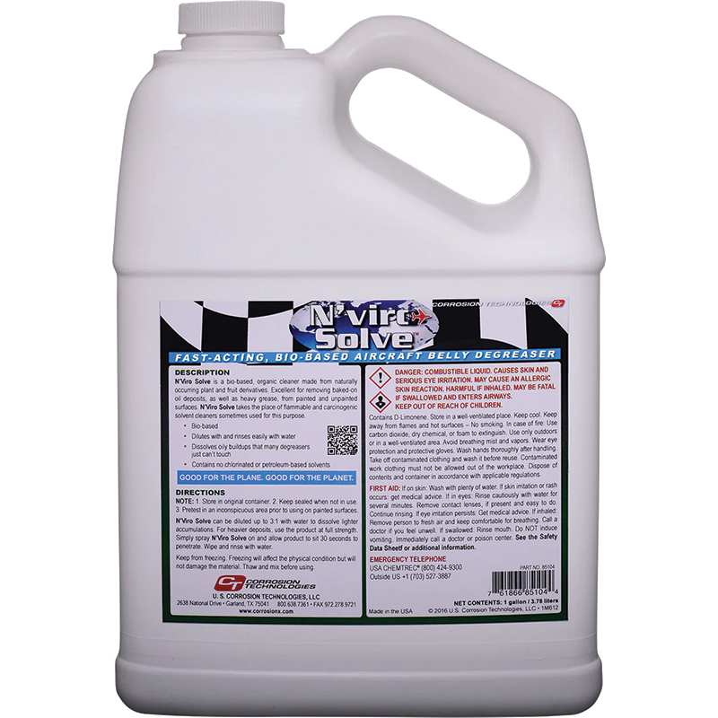 N'viro Solve Fast-acting, bio-based aircraft belly degreaser N'viro Solve is a bio-based organic cleaner made from various plant and fruit derivatives. This naturally occurring degreaser removes baked-on oil deposits, as well as heavy grease, from painted or unpainted surfaces. N'viro Solve will take the place of volatile solvent cleaners sometimes used for this purpose. N'viro Solve is totally biodegradeable when rinsed with water N'viro Solve can be diluted 3:1 with water to dissolve lighter accumulations. For heavier deposits, use product at full strength. Simply spray N'viro Solve on and allow product 30 seconds to penetrate. Wipe and rinse with water. |