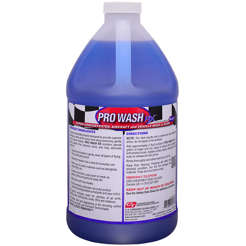 Pro Wash RX Pro Wash RX is a super-concentrated, pH balanced, premium shine enhancing soap designed to provide superior detergency while at the same time being extremely gentle on all vehicle finishes. Pro Wash RX contains special rinsing agents that help eliminate spotting and streaking. It's everything you want in a soap to baby your car, boat, airplane, motorcycle or RV! Add approximately 2 ounces of Pro Wash RX per 1 gallon of water. Apply with a sponge or soft bristled brush, and agitate the rich foamy suds lightly, allowing Pro Wash RX to release dirt and grime. Rinse thoroughly and either towel dry or air dry. |