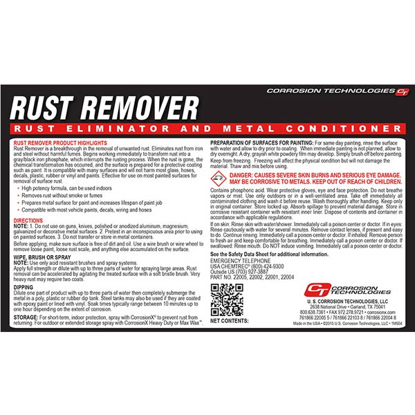 ATTENTION: *Not for use on nonferrous metals or on firearms, as Rust Remover will remove gun bluing. *Once rust has been removed, it is important to treat the metal with some kind of protective coating so that the clean metal surface does not re-rust. |