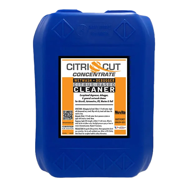 | NuVite CitriCut is a citrus based airframe wetwash and wipedown cleaner. Pleasant citrus smelling wet wash or wipe down cleaner that is especially friendly to the environment. Works great for standard wet washing with mops or scrub pads. When used as a wet wash, water sheets off, minimizing water spotting. CitriCut is also handy for hand debugging or hand wipe down without need for rinse -so there is no need for water or floor cleanup. Spray CitriCut at 1:8 from hand trigger sprayer for hand debugging or wipedown and wipe with terry towel until clean. Use a clean towel to buff up surface shine. No need to rinse surface. Supplied as concentrate—use 1:8 for hand wipe down or 1:16 in wet wash water. |