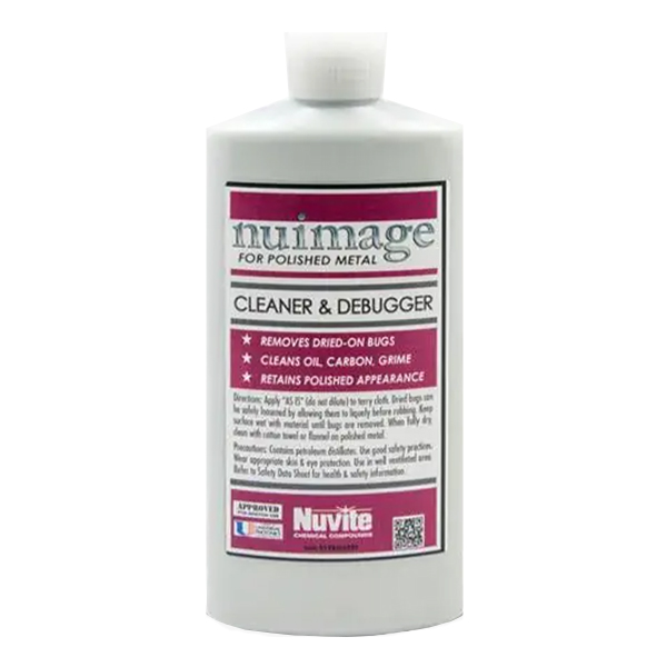 Nuvite NuImage is the answer to debugging and oil removal problems on your show-quality brightwork! NuImage will clean and debug your outstanding polish job without the fogging of normal cleaners, and will save you time and effort while it helps you maintain that famous "Nuvite Look" you get with Nuvite NuShine II metal polishes! NuImage works great for cleaning polished skins on aircraft bellies and cowlings, removing oils and fluids without the rainbow effect that are usually left on the surface from oil residue. And, it's easy, to put NuImage on a soft cotton flannel rag and apply, wetting bug spots, rubbing gently and spreading over the surface until clean. Continue over the surface, and when complete, final buff away the slight, dried haze to reveal the beautiful clear shine. Nuvite NuImage even works great as a final cleanup for black metal polish residue on paint, and will help remove excess polish after power buffing. NuImage: the ANSWER to polished metal cleaning & upkeep! |