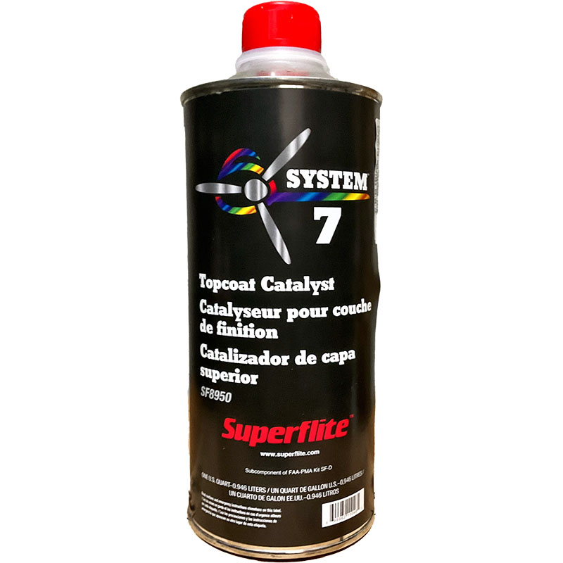 | Catalyst for the Superflite System 7 Superflex topcoat. Mixing Ratio: Mix 2 parts paint to 1 part SF8950 catalyst. Thin with a 1/2 part of one of the 7800-series reducers. Safety: Fresh air breathing mask, safety goggles, and skin protection required. |