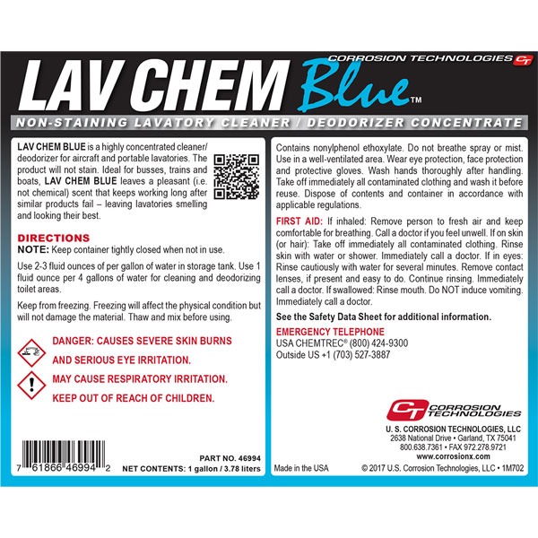 | Lav Chem Blue/Clear is a highly concentrated lavatory cleaner and deodorizer for aircraft and portable lavatories / toilets. Ideal for buses, trains and boats, Lav Chem Blue/Clear leaves a pleasant (i.e. not chemical) scent that keeps working long after similar products fail – leaving lavatories smelling and looking their best. |
