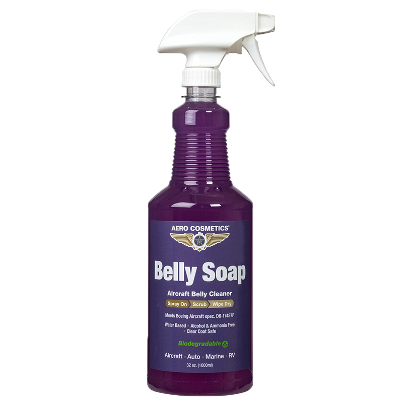 Belly Soap, The quickest and easiest way to clean the dirtiest aircraft bellies and engine areas that are mixed with dried or baked-on hydraulic fluids and oils. It also works great on RVs, Cars, Boats, and Motorcycles. Safely removes grease, oil, hydraulic fluid, and exhaust soot. Simply spray on and wipe dry. Safe on all vehicle surfaces wet or dry. Meets Boeing Aircraft cleaning Spec. Exterior D6-17487P. For tough cleaning jobs, use with the Aero Scrubber. Note: Color of product can fluctuate due to temperature. Application and effectiveness is not affected. |
