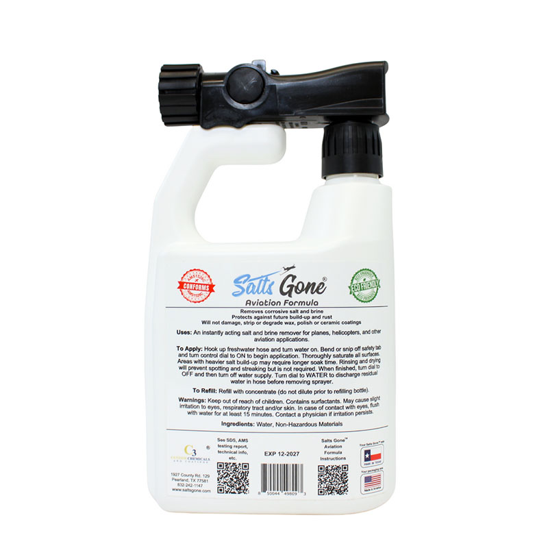 • Elevate aircraft maintenance with the Salts Gone® Aviation Formula 32oz Hose End Sprayer. Tailored specifically for the aviation industry, this sprayer is your ally in preserving the integrity and appearance of your aircraft. Connect it directly to your garden hose for a seamlessly proportioned spray that covers efficiently and effectively—eliminating the guesswork and ensuring consistent, top-notch results every single use.