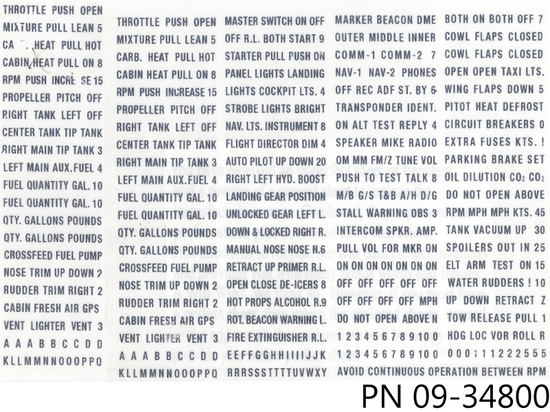 Over 200 pressure sensitive labels and words conveniently grouped for ease of transfer to airplane controls or instrument panel. Available in two type sizes (see illustration) and in black or white lettering (specify).