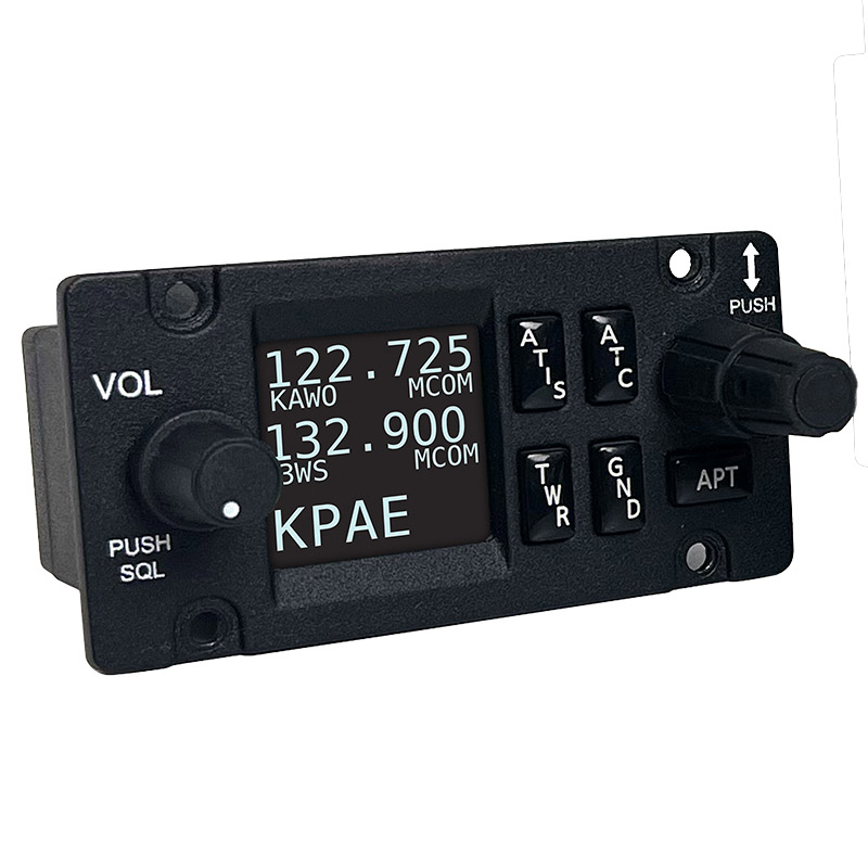 The SkyView COM Radio will change the way you use an aircraft radio. By integrating deeply with your Dynon SkyView system, the SkyView COM Radio tunes frequencies by airport and station type - rather than by spinning in a number - at the touch of a button. Dual watch allows you to listen for transmissions on both your active and standby frequencies simultaneously, with the active taking priority at all times. Use dual watch to monitor an alternate frequency in busy airspace or listen to ATIS without missing anything on the active. |