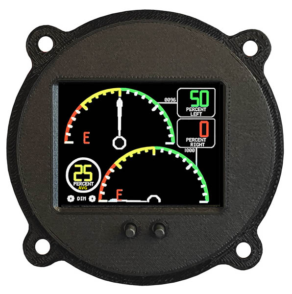 **NOT FAA APPROVED - FOR USE IN EXPERIMENTAL AIRCRAFT ONLY**Radiant Fuel Gauge - Gen 2 The GEN-2 Fuel Gauge is designed to work with either one or two industry-standard 0 – 5 volt probes, as is common with capacitive probes, or with either one or two industry-standard resistive probes, which are often referred to as float-style probes. Instruments are offered for both 2 1/4" and 3 1/8" panel cutouts. The current fuel level is shown as a standard dial for one or two tanks, along with a digital representation for each tank. The RADIANT GEN-2 Single or Dual Tank Fuel Gauge shows current contents of one or two tanks and the system voltage. Time to Empty is automatically calibrated. Works with float probes or capacitance probes. Shows fuel consumption trend from two tanks over the last 15 minutes. Our RADIANT GEN-2 instrument line combines many functions into simple, small, lightweight units. They utilize sunlight readable full color high contrast LCD screens which are also friendly with sunglasses. The Fuel Gauge instruments offer a RADIANT crafted feature: persistence. This feature displays the last history of the information. For example, the last 15 minutes of fuel level information is shown graphically, along with the current fuel level. This allows the pilot to look at the information on the display screen and make better-informed decisions, as opposed to the lack of history provided by traditional steam gauges. |