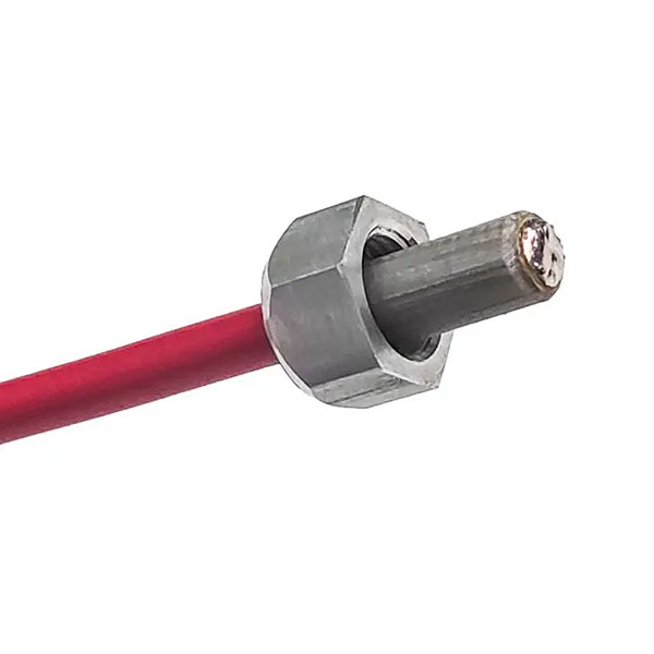 The thread on the nut is 7/16-28 and the wire is 14ga.