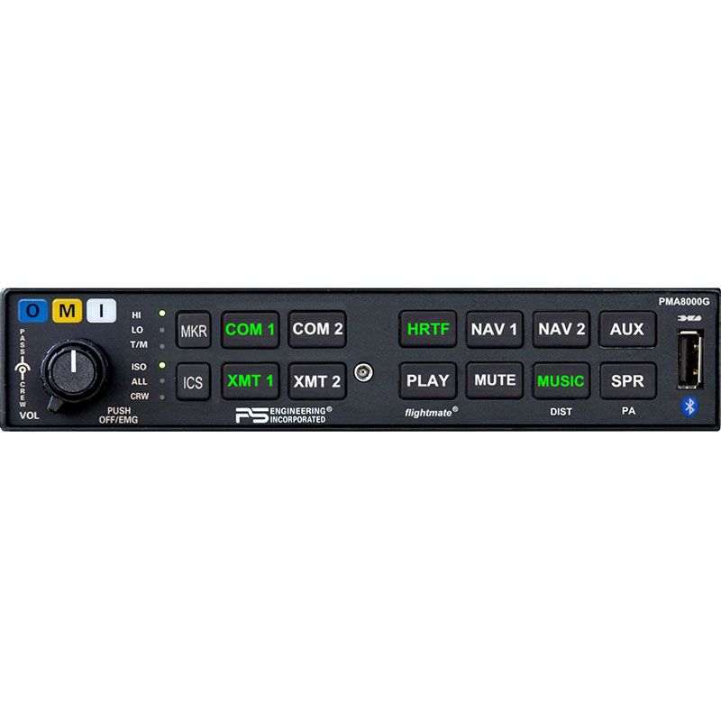 The PMA8000G marks a major milestone in the company’s innovative history. Third generation user interface along with advanced digital processing, makes this a perfect fit for pilots who expect more from their audio panel while not wanting complexity. The PMA8000G is a natural choice for pilots who demand ease of use with a deep set of audio panel capabilities. Introducing flightmate®, the first multi-function digital recorder/audio system available in an audio selector panel. Functions such as creating 4 aural alerts, creating checklists, and an instant aircraft radio playback are all part of this emergency procedures, just about anything that pilot can say, they can store into non-volatile memory, making those checklist chores a bit easier. flightmate® also allows the creation of aural alert that are programmed by the pilot using a few front panel key presses while speaking into the pilot’s microphone. This records these annunciations in locations that are specific to one of the four discrete inputs of the audio panel. Anytime there is a change of state (a out of limit condition or a Sonalert starts to sound off) the associated message will sound out until it is acknowledged. One of the four discrete messages is designed specifically for Sonalerts, the other three are for logic levels, typically coming from electronic engine instruments or other devices that give a change of state during a pre-set condition. IntelliAudio® is another standard capability that will make listening to multiple radio calls manageable. With Com 1 in the 10 O’clock position and Com 2 in the 2 O’clock position, pilots can pay attention to the radio that is most important at any one instant of time. Bluetooth® interconnectivity allows the pilot to have access to their Bluetooth® enabled telephone or entertainment device. The ability to contact ATC by way of the telephone with the engines running and radios tuned and set at an uncontrolled airfield makes getting into the air under IFR condition much easier. And like all of our PMA8000 series, there are front panel configuration that allows both the pilot and copilot to configure the intercom to best suite the needs of the cockpit crew and passengers. We have also included a USB charging port that is rated at 10 watts. This charger provides enough power for iPads that are running the most demanding application. We also took a fresh approach to the user interface, making access to the advance functions much easier than in past iterations of the PMA8000 series.