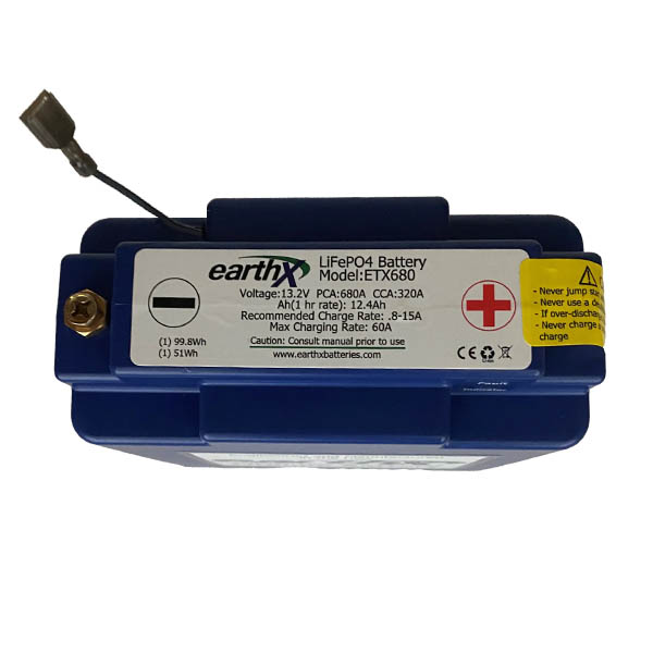 Note: Not FAA Approved. Intended for use in experimental aircraft only. When quality, performance, and safety matter, EarthX is the most trusted and used brand by experimental aircraft manufacturers and experimental aircraft owners, and endorsed by engine companies such as Rotax, Continental, ULS Power and Viking. Remove weight and increase power, all with one product! These ETX Hundred series (ETX680C, ETX680, ETX900 and the ETX1200) batteries are recommended for your primary engine aircraft battery. These models are equipped with redundant electronic circuits on the BMS board and have an LED battery fault light indicator to alert you to cell health and state of charge. The battery management features include over discharge protection, over charge protection, short circuit protection up 1000 amps, excessive cranking protection (temperature sensing) in addition to integrated cell balancing technology. With an EarthX lithium battery, you will gain a significant amount of cranking amps and drop a minimum of 11+ pounds instantly by switching from a lead acid battery. Please view the Aircraft Application Flowchart under the documents tab for assistance in selecting the correct EarthX battery for your application. Additional Specs