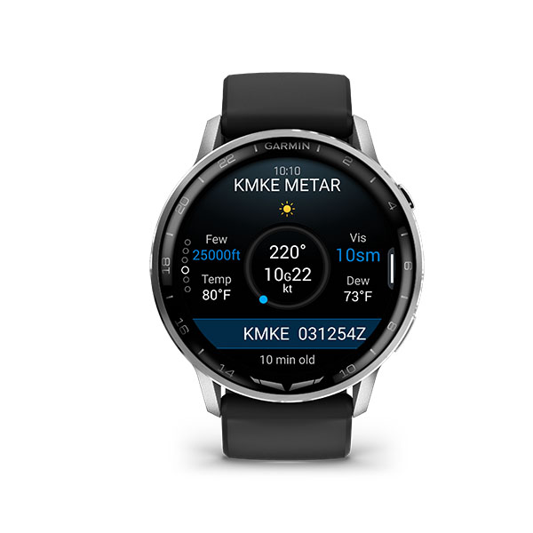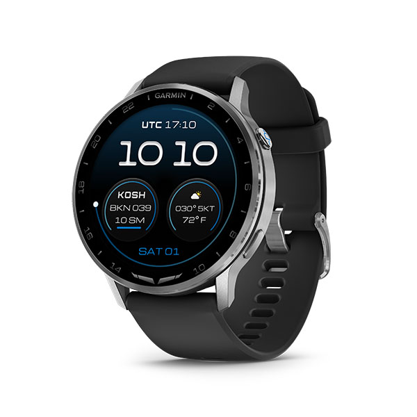 Designed for life in and out of the cockpit, the D2™ Air X15 aviator smartwatch combines exclusive piloting tools — for weather, navigation and flight logging — plus advanced training, fitness and wellness features. With its bright 1.4" AMOLED display and built-in LED flashlight, the watch comes equipped for flight with an aeronautical database, HSI and Direct-to navigation capability. Use the Garmin Pilot™ app to transfer flight plans and receive avionics data and alerts on your wrist. The built-in speaker and microphone let you make and take calls from your wrist when your watch is paired with your smartphone. Stay flight-ready with strength training plans, daily suggested workouts and monitoring of heart rate, respiration, stress, sleep and more (data presented is intended to be a close estimation of metrics tracked). With up to 10 days of battery life in smartwatch mode, D2 Air X15 powers through your busy schedule. The 45mm watch case comes in a stainless steel or slate metal bezel with a black silicone band. |