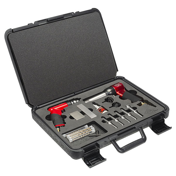For perfect riveting jobs, ATS gives you the ATS Pro Rivet Gun with feather trigger (including springs), two of ATS most popular Tungsten bucking bars, and a full set of riveting snaps. Included is a set of rivet gauges to make sure you get things right, and a bottle of oil to keep those tools running at peak performance. It all comes to with a quality shadow-foamed hard tool case, making this the kit you will want to show off! |