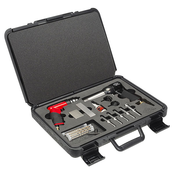 For perfect riveting jobs, ATS gives you the ATS Pro Rivet Gun with feather trigger (including springs), two of ATS most popular Tungsten bucking bars, and a full set of riveting snaps. Included is a set of rivet gauges to make sure you get things right, and a bottle of oil to keep those tools running at peak performance.