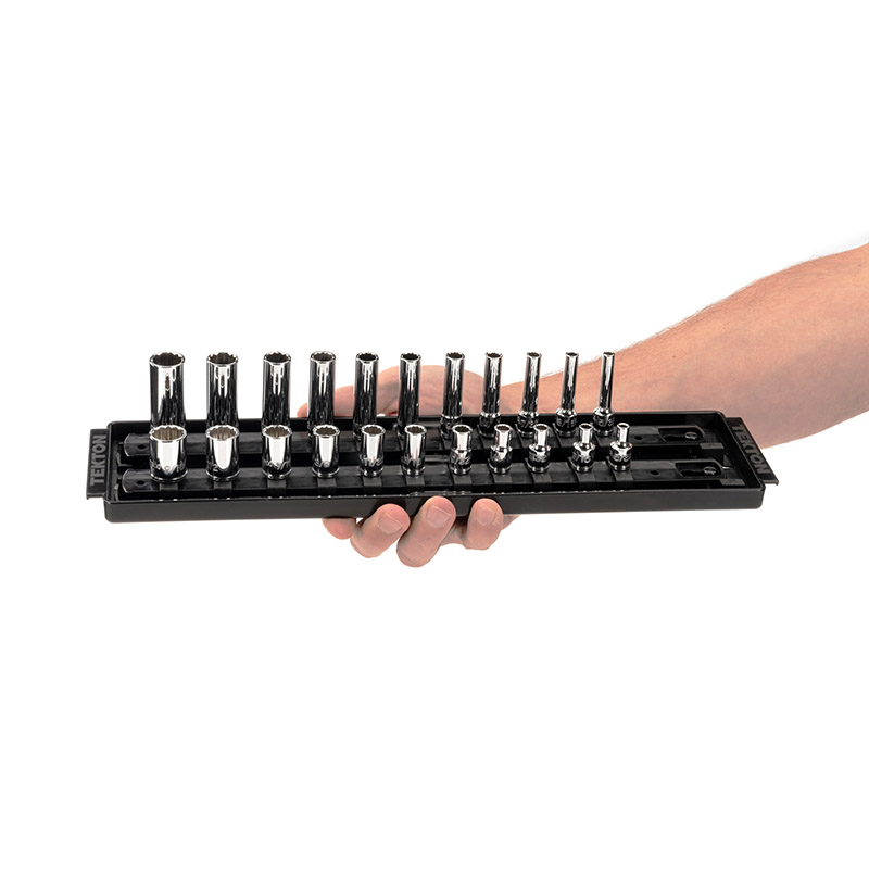 Large, Stamped Markings - Permanently impressed into the material by a roll-stamp die. - As large as possible while still being readable along the socket's curved surface - Clearly visible size numbers with extra-deep outline ![]() Fully Stepped Shoulders Narrowed diameter stretches to the base of the socket on small, deep-length sizes. This provides greater reach into tight, recessed areas. ![]() ![]() Exterior and Interior Finishes - Chrome-plated exterior is highly corrosion resistant and wipes clean to a mirror finish - Interior is protected against rust with clear coat, rather than commonly-used metallic paint ![]() 12-Point Socket Opening Get more access positions for multiple types of fasteners. ![]() ![]() Prevents Fastener Round-Off Radiused corners prevent fastener round-off by applying force to a fastener's flat sides, rather than its corners. ![]() Secure Drive Tool Engagement Detent grooves and beveled edges provide a smooth and secure connection with the drive tool. ![]() High Torque Strength Meets minimum value of 1.2 times the ANSI standard for Proof Torque. Verified by a single-cycle test that applies torque until specified value is reached without failure or permanent deformation. ![]() Carrying Case - High-density polyethylene material withstands common lubricants, fuels, and solvents - Carrying handle, strong latches, and metal hinge pins - Molded size markings for each tool and a deep parts tray ![]() |