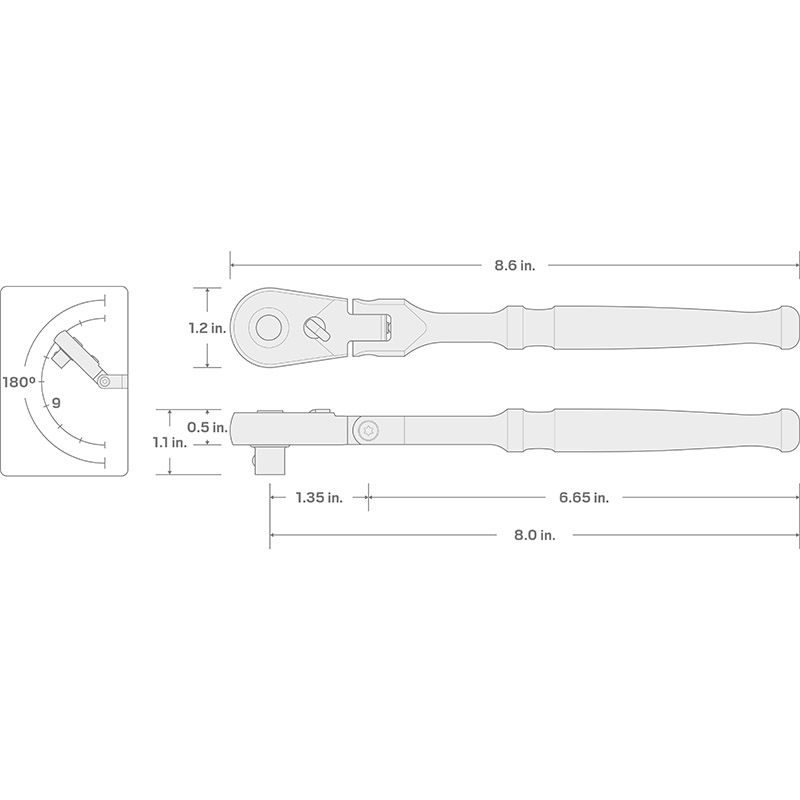 180° Flex, 9 Positions The flex head sweeps through 180 degrees, snapping to nine different detent angles to reach around obstacles. A spring-actuated pawl engages with well-defined teeth to hold the head in position. ![]() 90-Tooth Gear = 4º Swing Arc The single half-moon pawl maintains 9 teeth engaged with the gear at all times, ensuring that it won't slip or skip under stress. Ultra-Compact Head The box end is offset 15 degrees, creating clearance for your fingers and making it easier to reach around obstructions. ![]() Proof Torque Our ratchets meet (and most far exceed) the industry standard for Proof Torque, a measure of strength verified by a single-cycle test that applies torque until the specified value is reached without failure or any permanent deformation. Data from: “Category 10, Type 1, Class 2 Handles, Ratchet, Reversible.” ASME B107.110-2019 ![]() Working Handle Length The finger groove has pronounced interior edges for traction and control for any finger placement. The pommel at the end of the handle keeps your hand from slipping off and is rounded for comfort. ![]() Parts and Assembly ![]() |