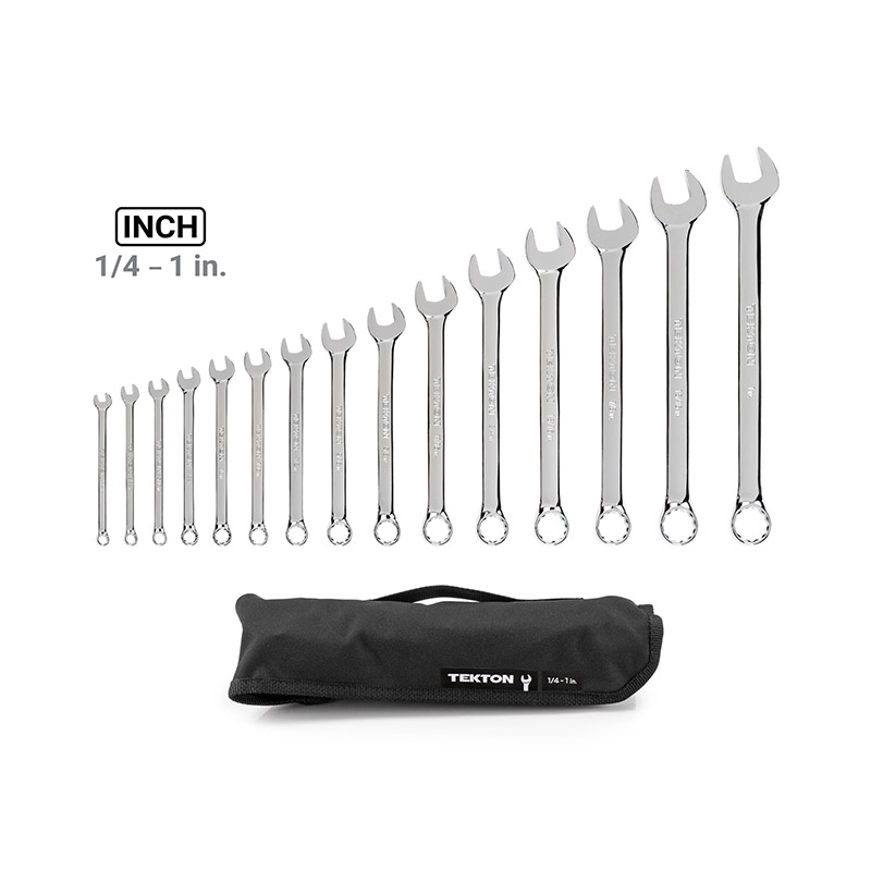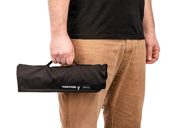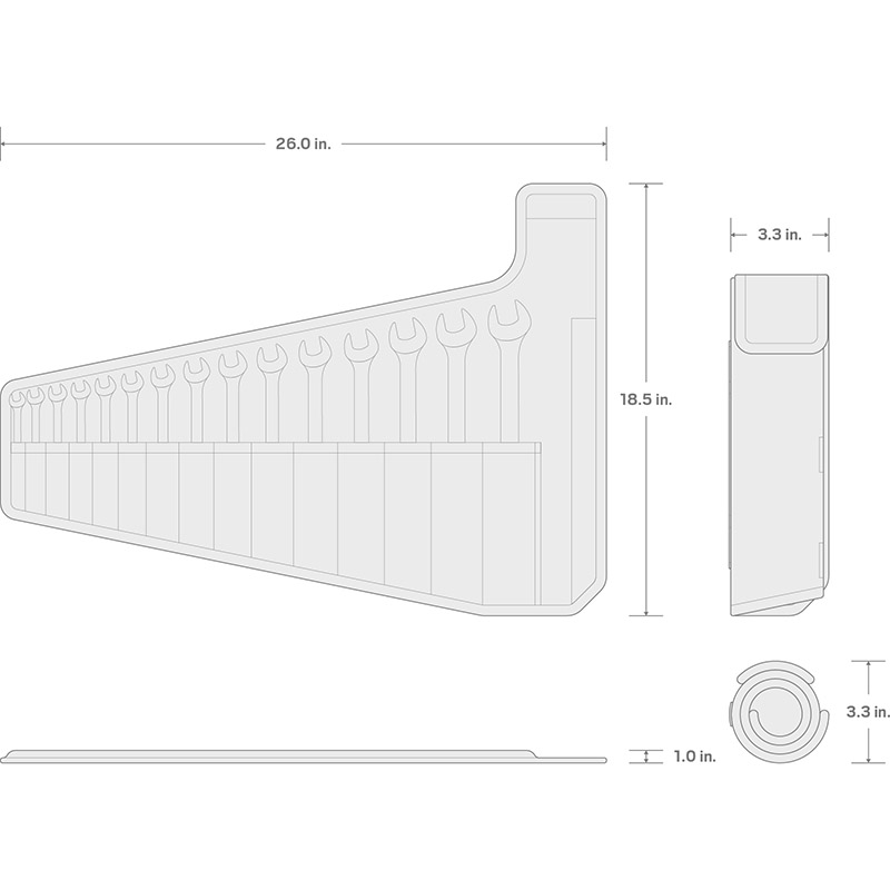 Angled Open End To reduce the working swing arc in tight spaces, the open end is angled 15 degrees so the wrench can be flipped over with each rotation to engage the fastener twice as often. ![]() 12-Point Box End A 12-point box end doubles the available access angles, as compared to a 6-point end. In order to prevent rounding off fasteners, the box end is designed to contact and apply force to the sides of a fastener head and not the corners. ![]() Offset Box End The box end is offset 15 degrees, creating clearance for your fingers and making it easier to reach around obstructions. ![]() Storage FeaturesIdeal for On-the-GoCarry combination wrenches anywhere with the compact roll-up pouch that keeps wrenches well-packed and unable to slide out. The handle wraps around the pouch to fully support the weight of the set. ![]() MOLLE-Compatible Webbing Attach the wrench pouch to other gear using stitched rows of heavy-duty polypropylene webbing. ![]() Durable Material The polyurethane-backed 600 x 600 denier polyester is both abrasion and tear resistant, and has a Durable Water Repellent (DWR) coating. ![]() Easy-Access Design The pouch design minimizes the bulk from extra material so the wrenches can be quickly accessed without any fabric flaps getting in the way. A second row of pockets provide the most compact fit for wrenches. |