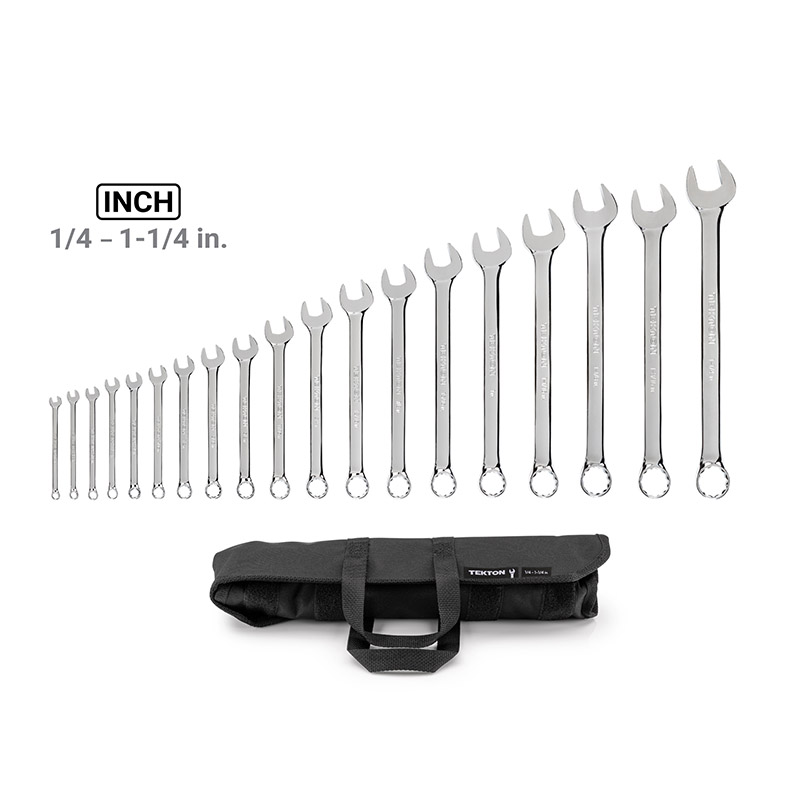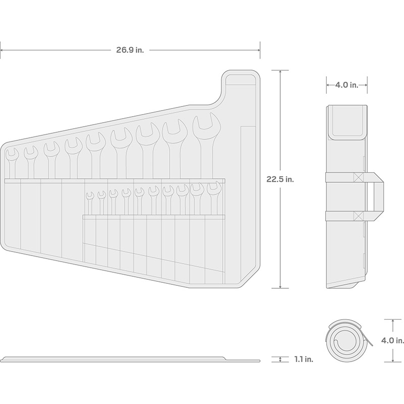 Angled Open End To reduce the working swing arc in tight spaces, the open end is angled 15 degrees so the wrench can be flipped over with each rotation to engage the fastener twice as often. ![]() 12-Point Box End A 12-point box end doubles the available access angles, as compared to a 6-point end. In order to prevent rounding off fasteners, the box end is designed to contact and apply force to the sides of a fastener head and not the corners. ![]() Offset Box End The box end is offset 15 degrees, creating clearance for your fingers and making it easier to reach around obstructions. ![]() Storage FeaturesIdeal for On-the-GoCarry combination wrenches anywhere with the compact roll-up pouch that keeps wrenches well-packed and unable to slide out. The handle wraps around the pouch to fully support the weight of the set. ![]() MOLLE-Compatible Webbing Attach the wrench pouch to other gear using stitched rows of heavy-duty polypropylene webbing. ![]() Durable Material The polyurethane-backed 600 x 600 denier polyester is both abrasion and tear resistant, and has a Durable Water Repellent (DWR) coating. ![]() Easy-Access Design The pouch design minimizes the bulk from extra material so the wrenches can be quickly accessed without any fabric flaps getting in the way. A second row of pockets provide the most compact fit for wrenches. |