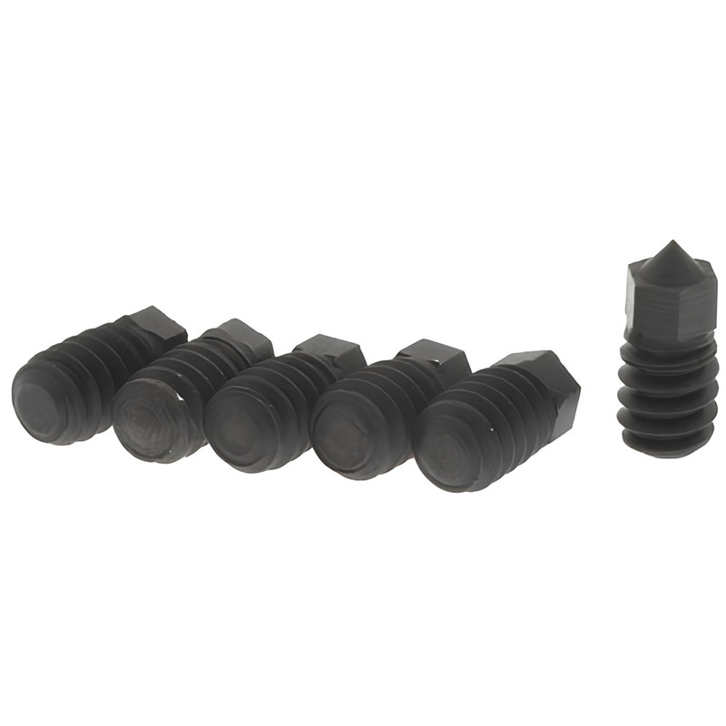 Ideal for use in layout, tool and die work; also can be used for locating fixtures, air cylinders, chucks, and general repairs. Aids in locating the die in proper relation to the punch on commercial die sets. Black oxide surface treatment. Hardness 48~52HRC. Complete set consists of four or six hardened hardened screws nested in a combined holder and wrench. |