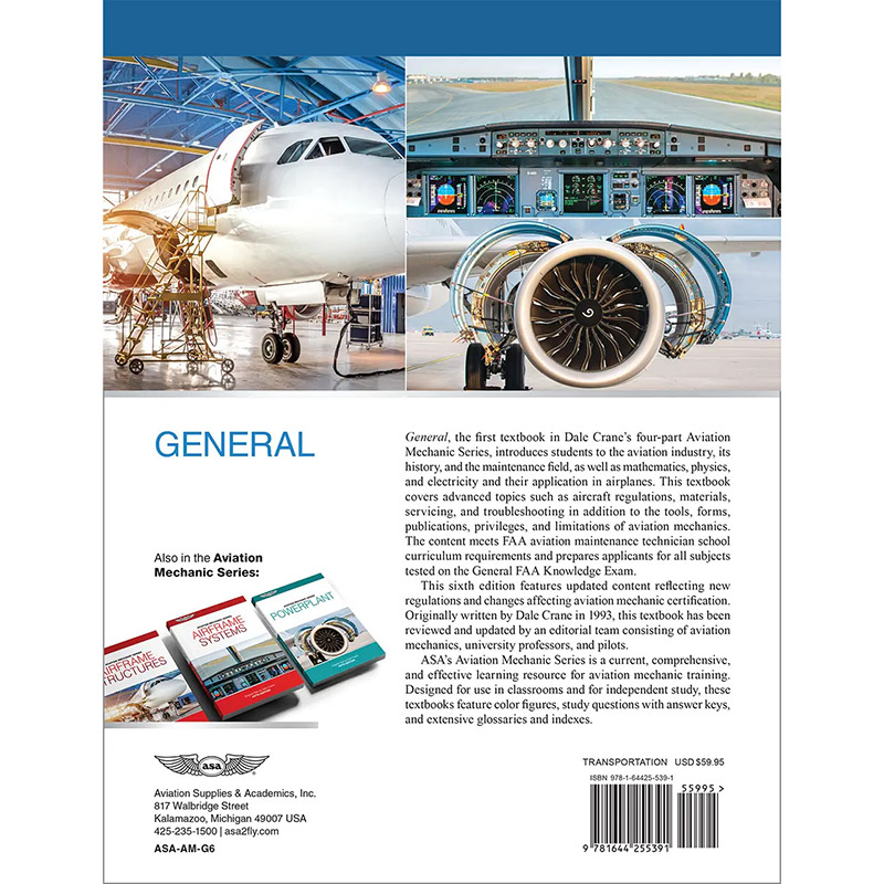 General, the first textbook in Dale Crane’s four-part Aviation Mechanic Series, introduces students to the aviation industry, its history, and the maintenance field, as well as mathematics, physics, and electricity and their application in airplanes. This textbook covers advanced topics such as aircraft regulations, materials, servicing, and troubleshooting in addition to the tools, forms, publications, privileges, and limitations of aviation mechanics. The content meets FAA aviation maintenance technician school curriculum requirements and prepares applicants for all subjects on the General FAA Knowledge Test.