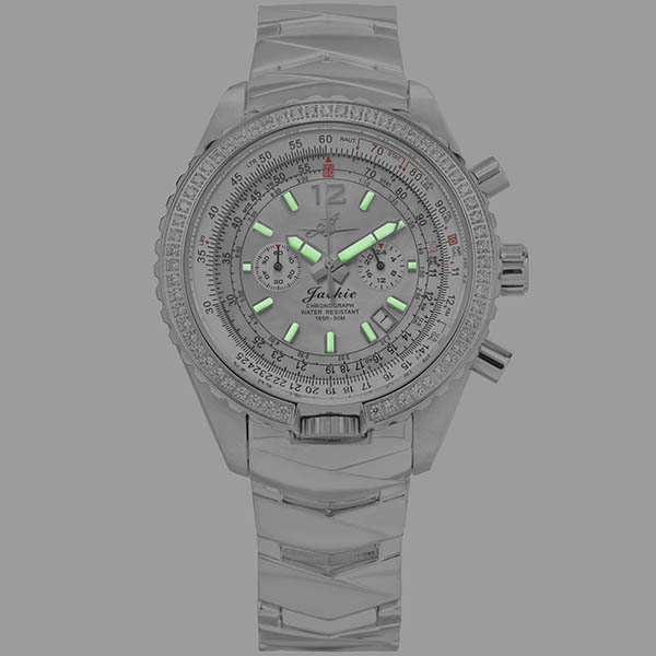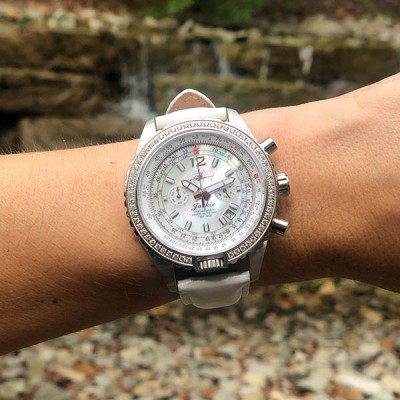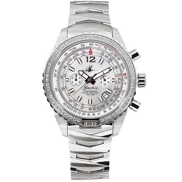 | A Mother-of-Pearl face and a Swarovski rotating bezel are what make this watch turn heads. But what makes the Jackie a brilliant chronograph timer is its E6B calculator, plus the ability to divide, multiply, and convert currency or the standard to metric system. |