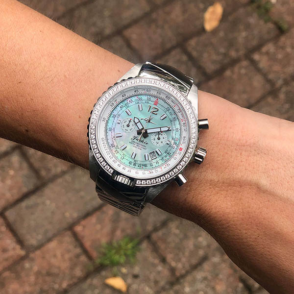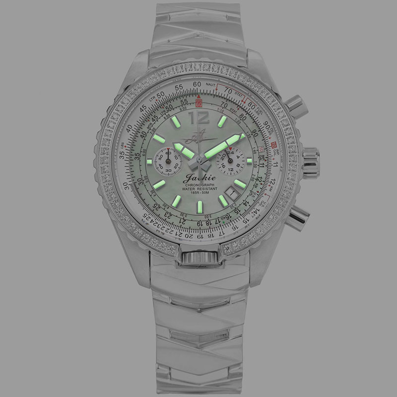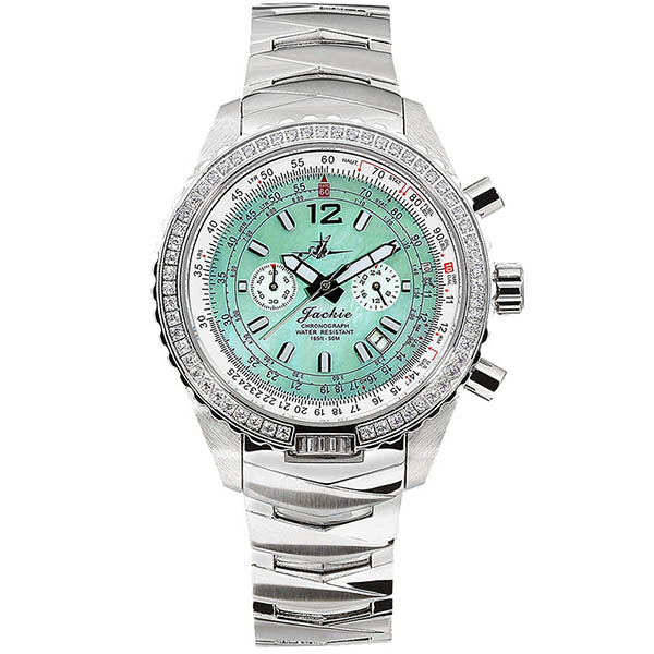 | A Mother-of-Pearl face and a Swarovski rotating bezel are what make this watch turn heads. But what makes the Jackie a brilliant chronograph timer is its E6B calculator, plus the ability to divide, multiply, and convert currency or the standard to metric system. |