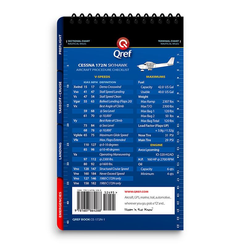 Qref BooksTopics Covered: Preflight, Takeoff/Cruise, Landing, Comprehensive Abnormals and Emergencies, V-speed list, cruise performance chart Get the most accurate, reliable aircraft checklist on the market with a Qref checklist. The procedures cover every aspect of flight, from preflight through takeoff, cruise, landing, and a comprehensive emergencies/abnormals section. Emergencies are arranged by system, meaning no more digging through pages to find the right section. Qref’s trademark is creating checklists that are easy for pilots to use. A major difference in aircraft checklists between Qref and others is the level of experience and expertise that go into every procedure. The Qref team of Master CFIs have over four decades of combined active flight instruction and flying experience at all levels of industry, with instruction and flight time in this aircraft. Further, they have taken advantage of the past 20 years of checklist design research. Qref’s team incorporates industry-best practices into these checklists and forthcoming publications. They not only create checklists, they use them in daily instruction and flying. Qref checklist design features a larger, more readable font, comprehensive procedures sectioned into tabs loaded with useful reference and conversions, and non-glare laminated pages. A complete table of contents makes finding the exact procedure quick. Find out for yourself why Qref aircraft checklists are fast becoming the Gold Standard in aviation. Qref CardsTopics Covered: Preflight, Takeoff/Cruise, Landing, Abnormals and Emergencies, V-speed list 2-card set: one for standard procedures, one for abnormals and emergencies. Q'Cards are designed for pilots who are already familiar with the aircraft but need an everyday checklist to keep relevant procedures at their fingertips. 5" x 9" (12.7 cm x 22.8 cm), the prefect size to fit on a yoke mount or kneeboard. Indestructible proprietary 10-mil laminate with non-glare, UV protective treatment means these checklists will withstand years of use. No other checklist has this! A major difference in aircraft checklists between Qref and others is the level of experience and expertise that go into every procedure. The Qref team of Master CFIs have over four decades of combined active flight instruction and flying experience at all levels of industry, with instruction and flight time in this aircraft. Further, they have taken advantage of the past 20 years of checklist design research. Qref’s team incorporates industry-best practices into these checklists and forthcoming publications. They not only create checklists, they use them in daily instruction and flying. Find out for yourself why Qref aircraft checklists are fast becoming the Gold Standard in aviation. |