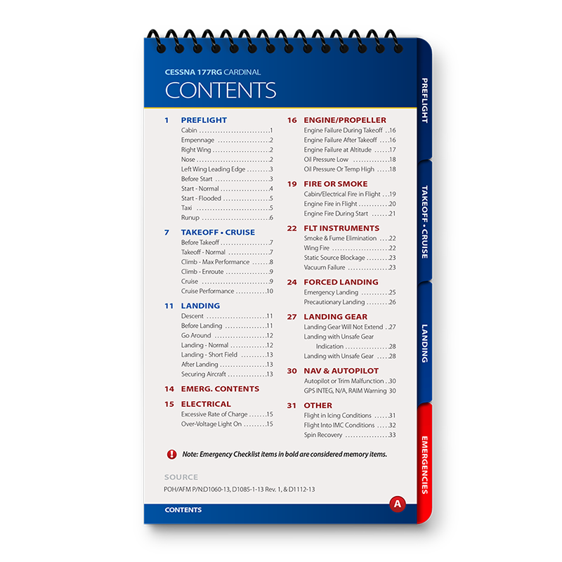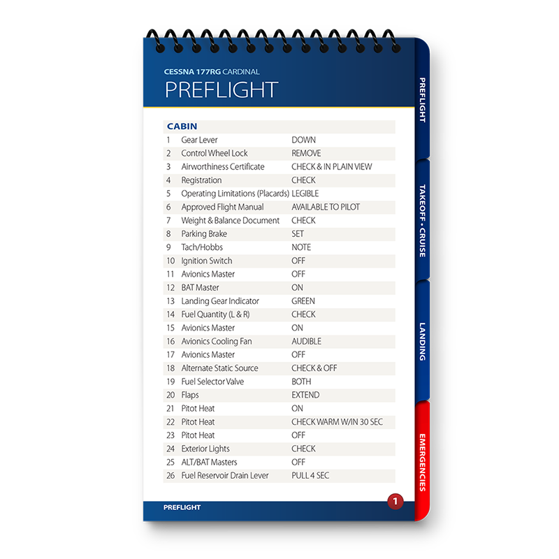 Qref BooksTopics Covered: Preflight, Takeoff/Cruise, Landing, Comprehensive Abnormals and Emergencies, V-speed list, cruise performance chart Get the most accurate, reliable aircraft checklist on the market with a Qref checklist. The procedures cover every aspect of flight, from preflight through takeoff, cruise, landing, and a comprehensive emergencies/abnormals section. Emergencies are arranged by system, meaning no more digging through pages to find the right section. Qref’s trademark is creating checklists that are easy for pilots to use. A major difference in aircraft checklists between Qref and others is the level of experience and expertise that go into every procedure. The Qref team of Master CFIs have over four decades of combined active flight instruction and flying experience at all levels of industry, with instruction and flight time in this aircraft. Further, they have taken advantage of the past 20 years of checklist design research. Qref’s team incorporates industry-best practices into these checklists and forthcoming publications. They not only create checklists, they use them in daily instruction and flying. Qref checklist design features a larger, more readable font, comprehensive procedures sectioned into tabs loaded with useful reference and conversions, and non-glare laminated pages. A complete table of contents makes finding the exact procedure quick. Find out for yourself why Qref aircraft checklists are fast becoming the Gold Standard in aviation. Qref CardsTopics Covered: Preflight, Takeoff/Cruise, Landing, Abnormals and Emergencies, V-speed list 2-card set: one for standard procedures, one for abnormals and emergencies. Q'Cards are designed for pilots who are already familiar with the aircraft but need an everyday checklist to keep relevant procedures at their fingertips. 5" x 9" (12.7 cm x 22.8 cm), the prefect size to fit on a yoke mount or kneeboard. Indestructible proprietary 10-mil laminate with non-glare, UV protective treatment means these checklists will withstand years of use. No other checklist has this! A major difference in aircraft checklists between Qref and others is the level of experience and expertise that go into every procedure. The Qref team of Master CFIs have over four decades of combined active flight instruction and flying experience at all levels of industry, with instruction and flight time in this aircraft. Further, they have taken advantage of the past 20 years of checklist design research. Qref’s team incorporates industry-best practices into these checklists and forthcoming publications. They not only create checklists, they use them in daily instruction and flying. Find out for yourself why Qref aircraft checklists are fast becoming the Gold Standard in aviation. |