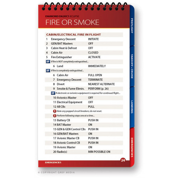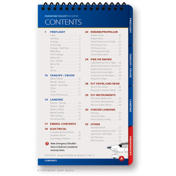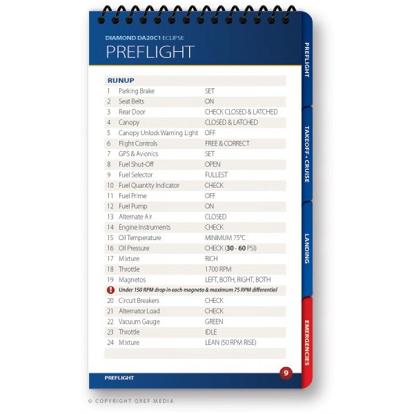 Qref BooksTopics Covered: Preflight, Takeoff/Cruise, Landing, Comprehensive Abnormals and Emergencies, V-speed list, cruise performance chart Get the most accurate, reliable aircraft checklist on the market with a Qref checklist. The procedures cover every aspect of flight, from preflight through takeoff, cruise, landing, and a comprehensive emergencies/abnormals section. Emergencies are arranged by system, meaning no more digging through pages to find the right section. Qref’s trademark is creating checklists that are easy for pilots to use. A major difference in aircraft checklists between Qref and others is the level of experience and expertise that go into every procedure. The Qref team of Master CFIs have over four decades of combined active flight instruction and flying experience at all levels of industry, with instruction and flight time in this aircraft. Further, they have taken advantage of the past 20 years of checklist design research. Qref’s team incorporates industry-best practices into these checklists and forthcoming publications. They not only create checklists, they use them in daily instruction and flying. Qref checklist design features a larger, more readable font, comprehensive procedures sectioned into tabs loaded with useful reference and conversions, and non-glare laminated pages. A complete table of contents makes finding the exact procedure quick. Find out for yourself why Qref aircraft checklists are fast becoming the Gold Standard in aviation. Qref CardsTopics Covered: Preflight, Takeoff/Cruise, Landing, Abnormals and Emergencies, V-speed list 2-card set: one for standard procedures, one for abnormals and emergencies. Q'Cards are designed for pilots who are already familiar with the aircraft but need an everyday checklist to keep relevant procedures at their fingertips. 5" x 9" (12.7 cm x 22.8 cm), the prefect size to fit on a yoke mount or kneeboard. Indestructible proprietary 10-mil laminate with non-glare, UV protective treatment means these checklists will withstand years of use. No other checklist has this! A major difference in aircraft checklists between Qref and others is the level of experience and expertise that go into every procedure. The Qref team of Master CFIs have over four decades of combined active flight instruction and flying experience at all levels of industry, with instruction and flight time in this aircraft. Further, they have taken advantage of the past 20 years of checklist design research. Qref’s team incorporates industry-best practices into these checklists and forthcoming publications. They not only create checklists, they use them in daily instruction and flying. Find out for yourself why Qref aircraft checklists are fast becoming the Gold Standard in aviation. |