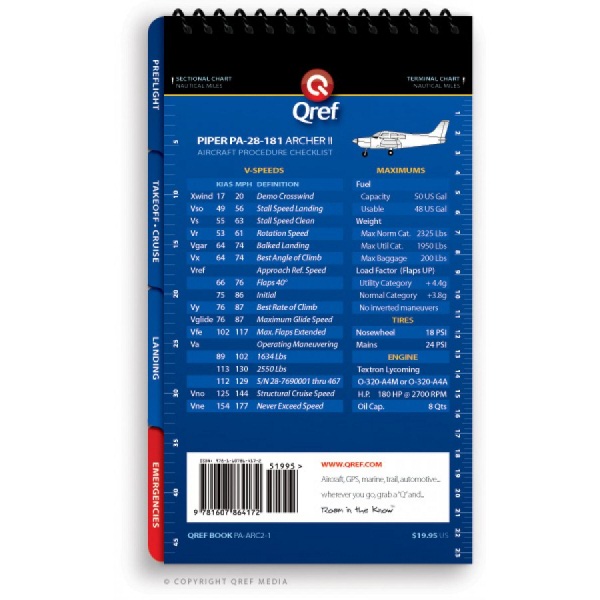 Qref BooksTopics Covered: Preflight, Takeoff/Cruise, Landing, Comprehensive Abnormals and Emergencies, V-speed list, cruise performance chart Get the most accurate, reliable aircraft checklist on the market with a Qref checklist. The procedures cover every aspect of flight, from preflight through takeoff, cruise, landing, and a comprehensive emergencies/abnormals section. Emergencies are arranged by system, meaning no more digging through pages to find the right section. Qref’s trademark is creating checklists that are easy for pilots to use. A major difference in aircraft checklists between Qref and others is the level of experience and expertise that go into every procedure. The Qref team of Master CFIs have over four decades of combined active flight instruction and flying experience at all levels of industry, with instruction and flight time in this aircraft. Further, they have taken advantage of the past 20 years of checklist design research. Qref’s team incorporates industry-best practices into these checklists and forthcoming publications. They not only create checklists, they use them in daily instruction and flying. Qref checklist design features a larger, more readable font, comprehensive procedures sectioned into tabs loaded with useful reference and conversions, and non-glare laminated pages. A complete table of contents makes finding the exact procedure quick. Find out for yourself why Qref aircraft checklists are fast becoming the Gold Standard in aviation. Qref CardsTopics Covered: Preflight, Takeoff/Cruise, Landing, Abnormals and Emergencies, V-speed list 2-card set: one for standard procedures, one for abnormals and emergencies. Q'Cards are designed for pilots who are already familiar with the aircraft but need an everyday checklist to keep relevant procedures at their fingertips. 5" x 9" (12.7 cm x 22.8 cm), the prefect size to fit on a yoke mount or kneeboard. Indestructible proprietary 10-mil laminate with non-glare, UV protective treatment means these checklists will withstand years of use. No other checklist has this! A major difference in aircraft checklists between Qref and others is the level of experience and expertise that go into every procedure. The Qref team of Master CFIs have over four decades of combined active flight instruction and flying experience at all levels of industry, with instruction and flight time in this aircraft. Further, they have taken advantage of the past 20 years of checklist design research. Qref’s team incorporates industry-best practices into these checklists and forthcoming publications. They not only create checklists, they use them in daily instruction and flying. Find out for yourself why Qref aircraft checklists are fast becoming the Gold Standard in aviation. |