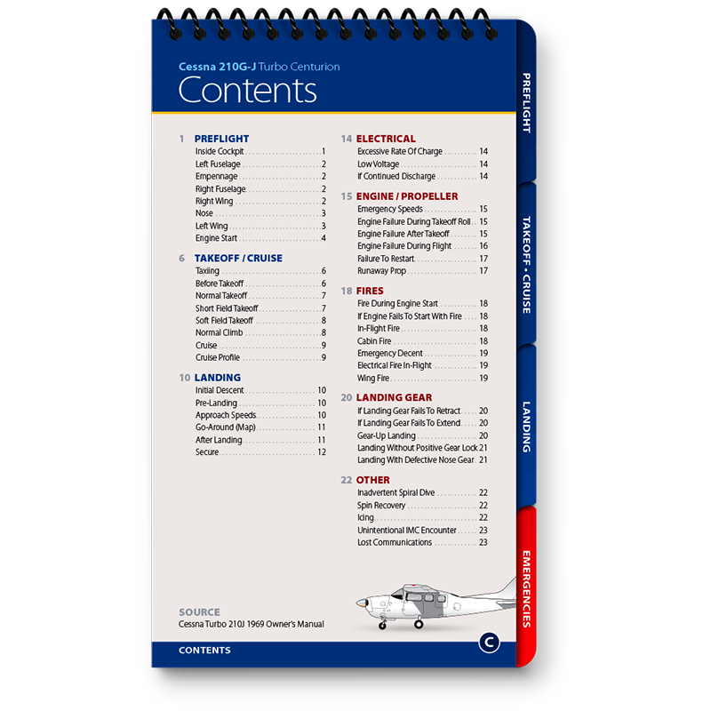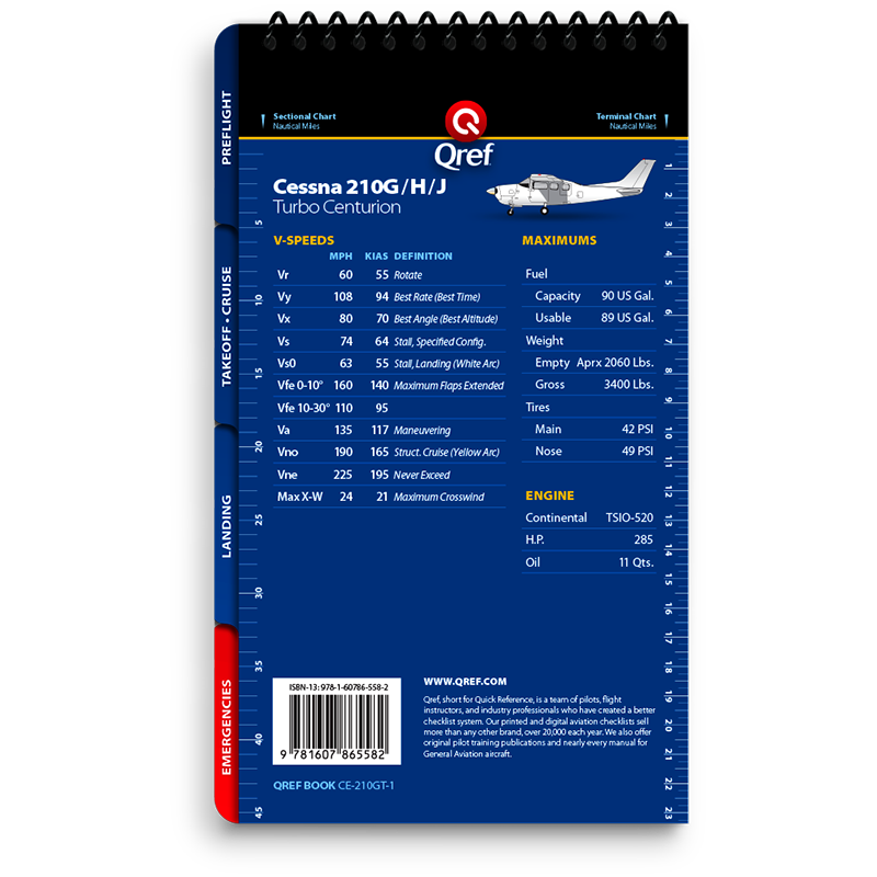 Qref BooksTopics Covered: Preflight, Takeoff/Cruise, Landing, Comprehensive Abnormals and Emergencies, V-speed list, cruise performance chart Get the most accurate, reliable aircraft checklist on the market with a Qref checklist. The procedures cover every aspect of flight, from preflight through takeoff, cruise, landing, and a comprehensive emergencies/abnormals section. Emergencies are arranged by system, meaning no more digging through pages to find the right section. Qref’s trademark is creating checklists that are easy for pilots to use. A major difference in aircraft checklists between Qref and others is the level of experience and expertise that go into every procedure. The Qref team of Master CFIs have over four decades of combined active flight instruction and flying experience at all levels of industry, with instruction and flight time in this aircraft. Further, they have taken advantage of the past 20 years of checklist design research. Qref’s team incorporates industry-best practices into these checklists and forthcoming publications. They not only create checklists, they use them in daily instruction and flying. Qref checklist design features a larger, more readable font, comprehensive procedures sectioned into tabs loaded with useful reference and conversions, and non-glare laminated pages. A complete table of contents makes finding the exact procedure quick. Find out for yourself why Qref aircraft checklists are fast becoming the Gold Standard in aviation. Qref CardsTopics Covered: Preflight, Takeoff/Cruise, Landing, Abnormals and Emergencies, V-speed list 2-card set: one for standard procedures, one for abnormals and emergencies. Q'Cards are designed for pilots who are already familiar with the aircraft but need an everyday checklist to keep relevant procedures at their fingertips. 5" x 9" (12.7 cm x 22.8 cm), the prefect size to fit on a yoke mount or kneeboard. Indestructible proprietary 10-mil laminate with non-glare, UV protective treatment means these checklists will withstand years of use. No other checklist has this! A major difference in aircraft checklists between Qref and others is the level of experience and expertise that go into every procedure. The Qref team of Master CFIs have over four decades of combined active flight instruction and flying experience at all levels of industry, with instruction and flight time in this aircraft. Further, they have taken advantage of the past 20 years of checklist design research. Qref’s team incorporates industry-best practices into these checklists and forthcoming publications. They not only create checklists, they use them in daily instruction and flying. Find out for yourself why Qref aircraft checklists are fast becoming the Gold Standard in aviation. |