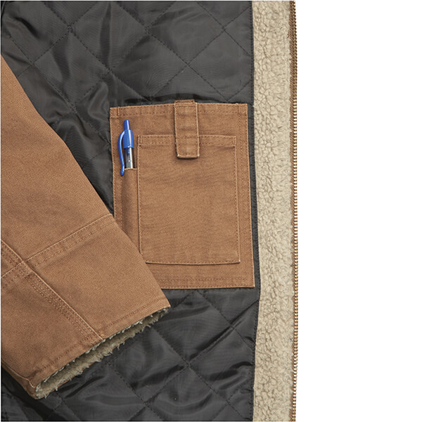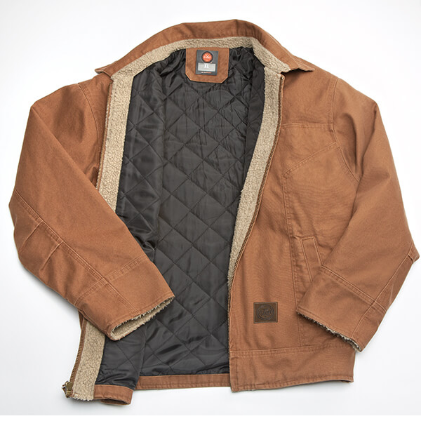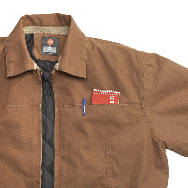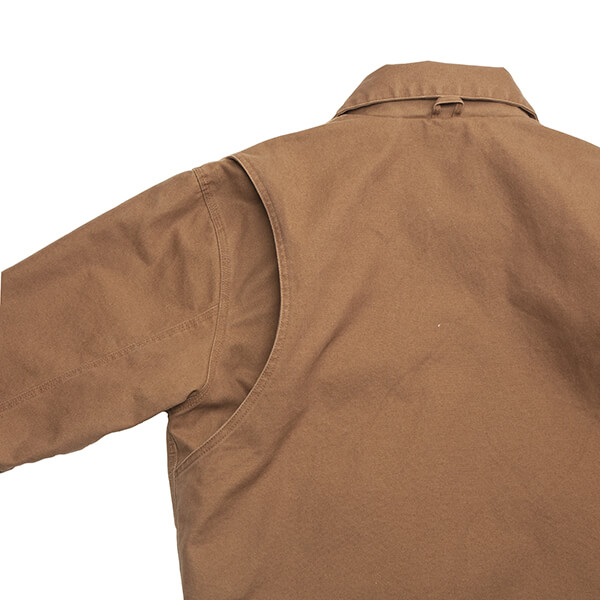 Bi-swing back, heavy canvas, hand warmer pockets, inside chest pocket w/velcro tab closure, outside chest pocket with metal zipper, snaps on bottom on each side and a quilted lining. Wow! This runs true to size, and more information is available on Flight Outfitters website.