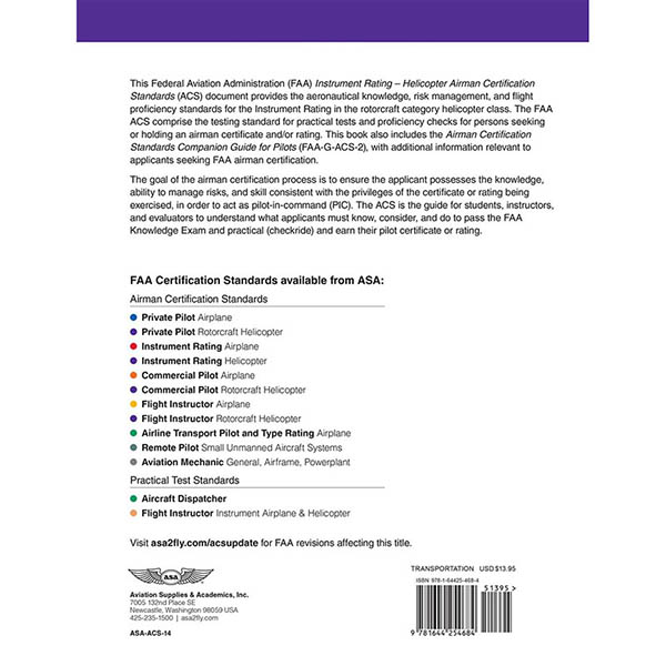 This Federal Aviation Administration (FAA) Instrument Rating Helicopter Airman Certification Standards softcover book (ACS-14), supersedes the Practical Test Standards (8081-4E), and is the guide for students, instructors, and evaluators to understand what applicants must know, do, and consider to pass their FAA Knowledge Exam and practical (checkride) and earn their instrument rating in the rotorcraft category, helicopter class. This ACS includes the aeronautical knowledge, risk management, and flight proficiency standards necessary for certification, ACS codes, and the Companion Guide (FAA-G-ACS-2).