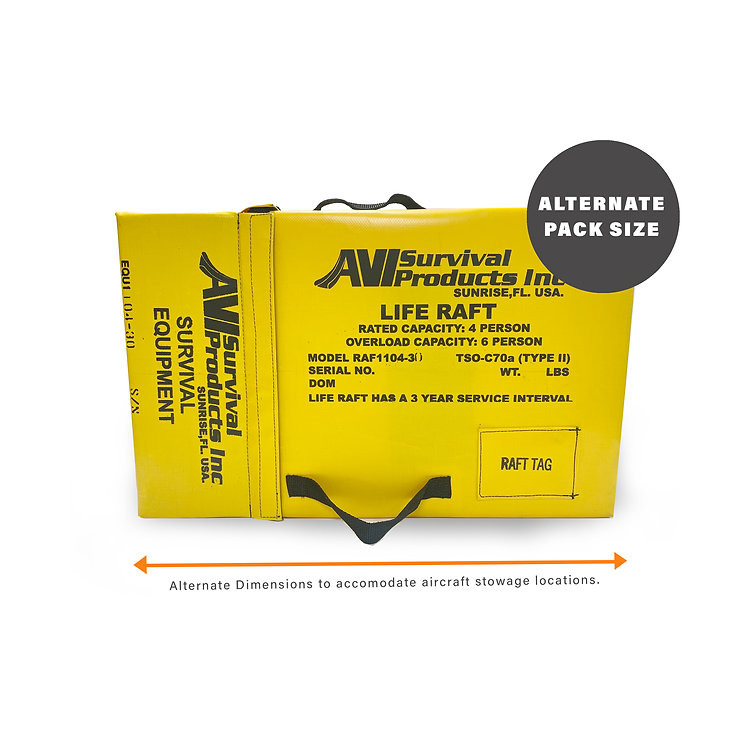 AVI Survival Products 4 Person Life Raft conforms to the latest FAA TSO C70a requirement. The life raft has a single tube inflatable, with an internal bulkhead design, creating two separate chambers. Classified as a Type II Non-Transport category life raft recommended for Corporate and General Aviation. The 4 Person life raft series is constructed with the latest Urethane coated Nylon Fabric using thermo bonding technology. This process heat seals the fabric, melting the seams together to ensure longevity of the raft. Each raft includes a stabilizing Water Ballast system, a hand pump, bailing bucket, a sea anchor, secured life-lines on the exterior perimeter of the raft for use of survivors in the water, and an inflation/retaining line that is attached to a high strength patch on the raft to prevent drifting and a water activated locator light. Aluminum cylinders and valves are added to reduce corrosion while packed and in use. The Soft-Pack Valise is made of heavy-duty polyester fabric with secured Velcro closures for a tightly packed raft. These rafts are engineered to reduce overall weight and deliver a compact design for easy transport and stowage for any aircraft compartment. AVI life rafts come with a 5-year warranty on parts and labor, built to last a lifetime with proper care. |