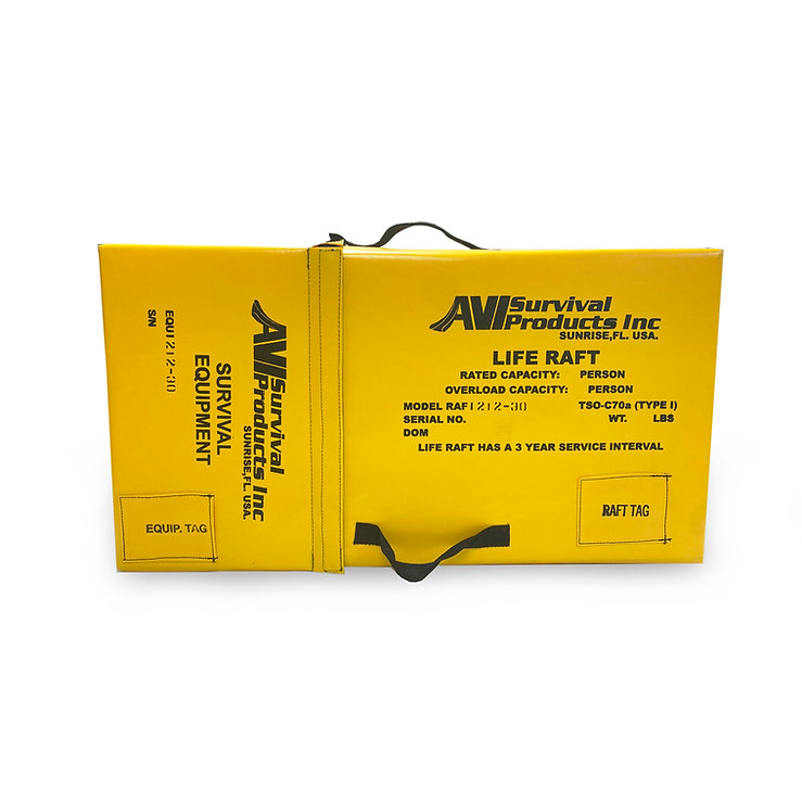 AVI Survival Products 12 Person Life Raft conforms to the latest FAA TSO C70a requirement. The life raft has a dual tube inflatable design, classified as a Type I, Transport category life raft recommended for Corporate and General Aviation. The 12 Person life raft series is constructed with the latest Urethane coated Nylon Fabric, that is manufactured using thermal bonding technology. This process heat seals the fabric, melting the seams together to ensure longevity of the raft. Each raft includes a stabilizing Water Ballast system, a hand pump, bailing bucket, a sea anchor, secured life-lines on the exterior perimeter of the raft for use of survivors in the water, and an inflation/retaining line that is attached to a high strength patch on the raft to prevent drifting and a water activated locator light. Aluminum cylinders and valves are added to reduce corrosion while packed and in use. The Soft-Pack Valise is made of heavy-duty polyester fabric with secured Velcro closures for a tightly packed raft. These rafts are engineered to reduce overall weight and deliver a compact design for easy transport and stowage for any aircraft compartment. AVI life rafts come with a 5-year warranty on parts and labor, built to last a lifetime with proper care. This raft includes the FAR 91, FAR 121, or FAR 135 Survival Equipment Kit that meets FAA regulations. The 406 ELT, which may be required by law for those who operate an airplane in extended overwater operations can be added to any kit. |