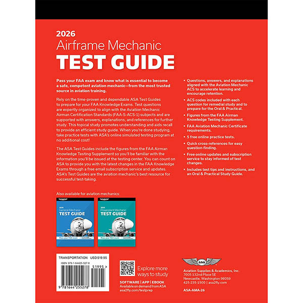 Pass your test and know what is essential to become a safe, competent aviation mechanic—from the most trusted source in aviation training. Rely on the time-proven and dependable ASA Test Guides to prepare for your FAA Knowledge Exams. Test questions are expertly organized to align with the Aviation Mechanic Airman Certification Standards (FAA-S-ACS-1) subjects and are supported with answers, explanations, and references for further study. This topical study promotes understanding and aids recall to provide an efficient study guide. When you’re done studying, take practice tests with ASA’s online simulated testing program at no additional cost! The ASA Test Guides include the figures from the FAA Airman Knowledge Testing Supplement so you’ll be familiar with the information you’ll be issued at the testing center. You can count on ASA to provide you with the latest changes in the FAA Knowledge Exams through a free email subscription service and updates. ASA’s Test Guides are the aviation mechanic’s best resource for successful test-taking.
